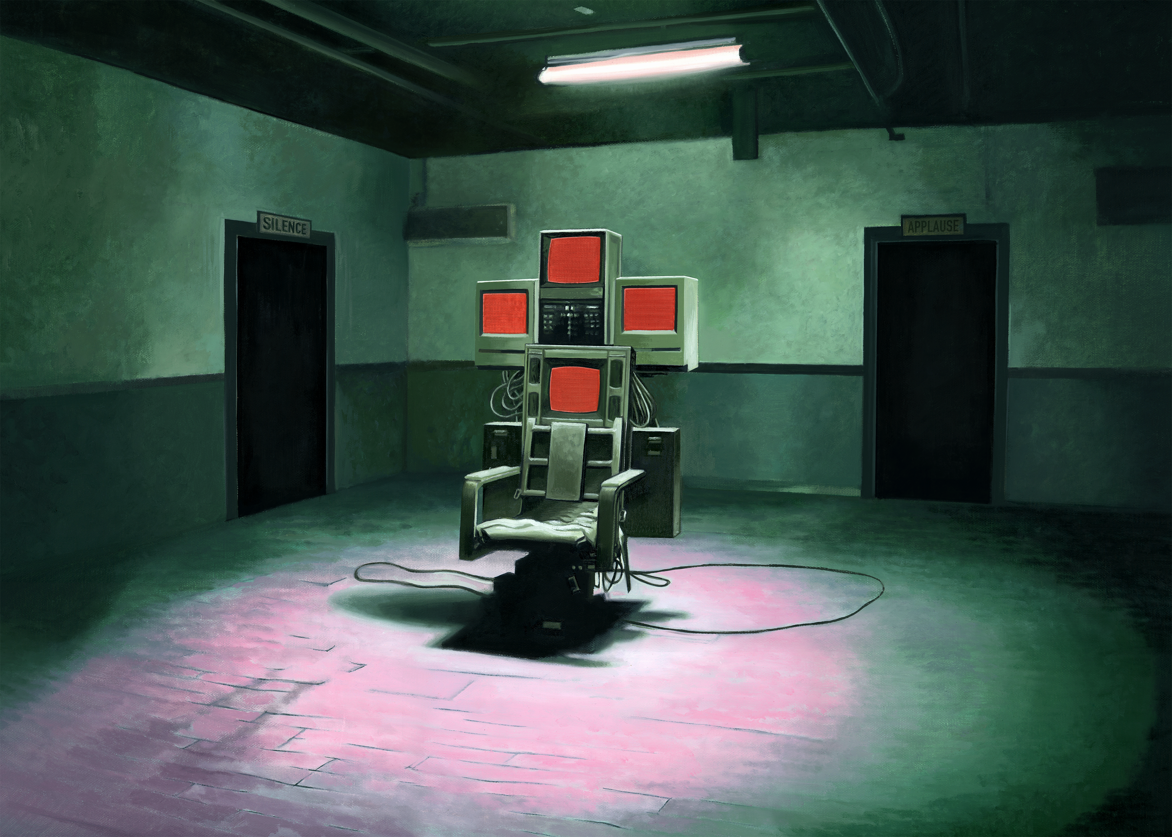 “COMPUTER DEATH”, a provocative yet subtle oil painting, pays homage to Andy Warhol’s “Electric Chair” series while offering a contemporary commentary on our relationship with technology. In this work, the familiar silhouette of the electric chair is replaced with a haunting depiction of a fictional computer death chair, symbolizing a potentially universal struggle of technological self-entrapment and slow decay of our own human flesh.