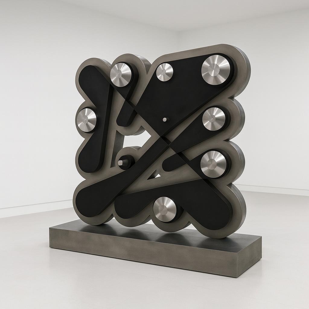 Floor Ringer brings the code into three dimensions for the first time, here in stainless steel, patina, and aluminum.
