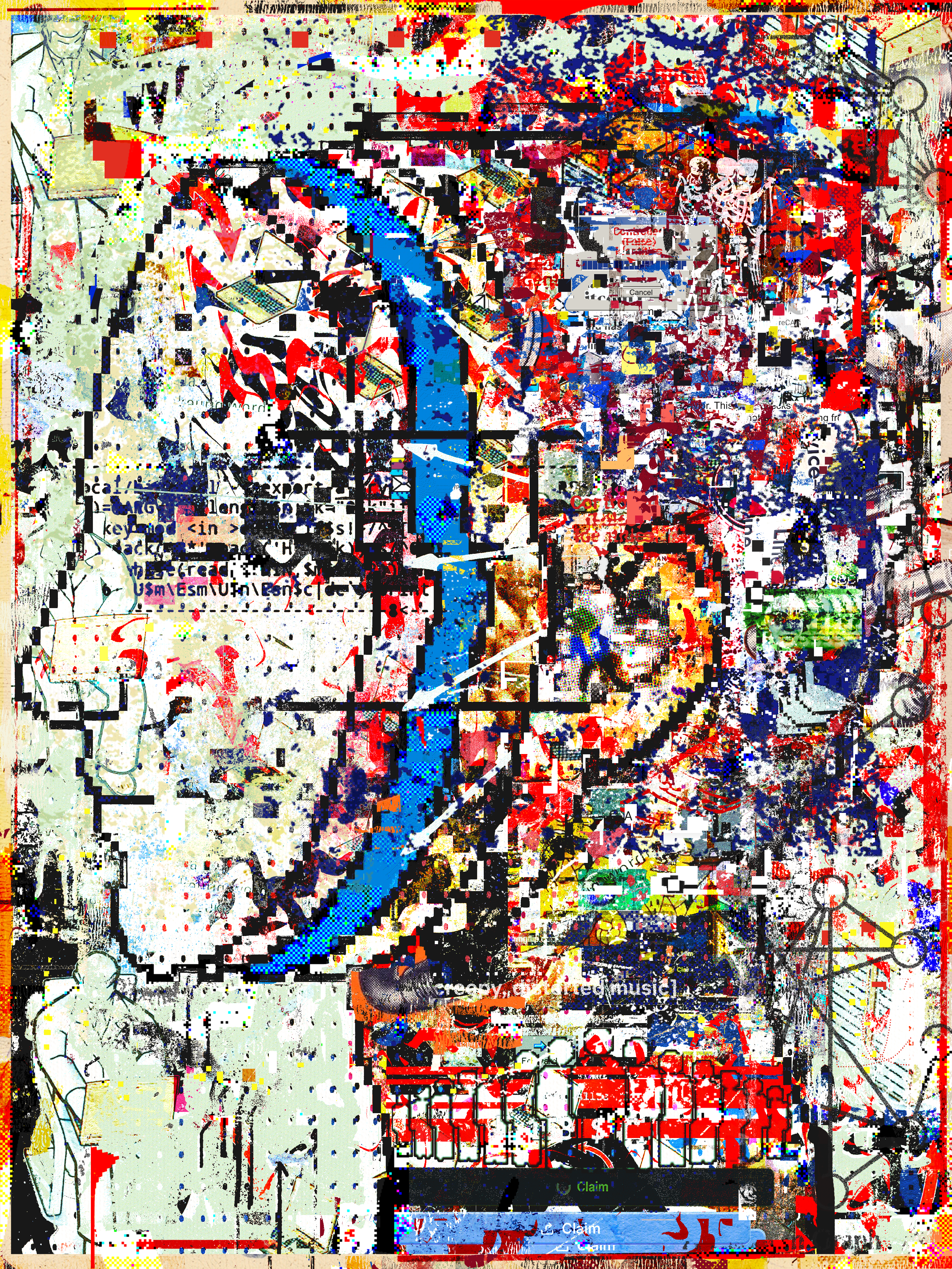This collage is an attempt to sew all of these concepts together into a chaotic abstract tapestry. Channeling Raushchenberg's collage paintings (which have always served as a type of north star for me) and combining my love for scientific diagrams and early internet browser imagery I tried to express the challenge of parsing the real from the fake... and every aspect of that challenge makes me simultaneously giddy and horrified.