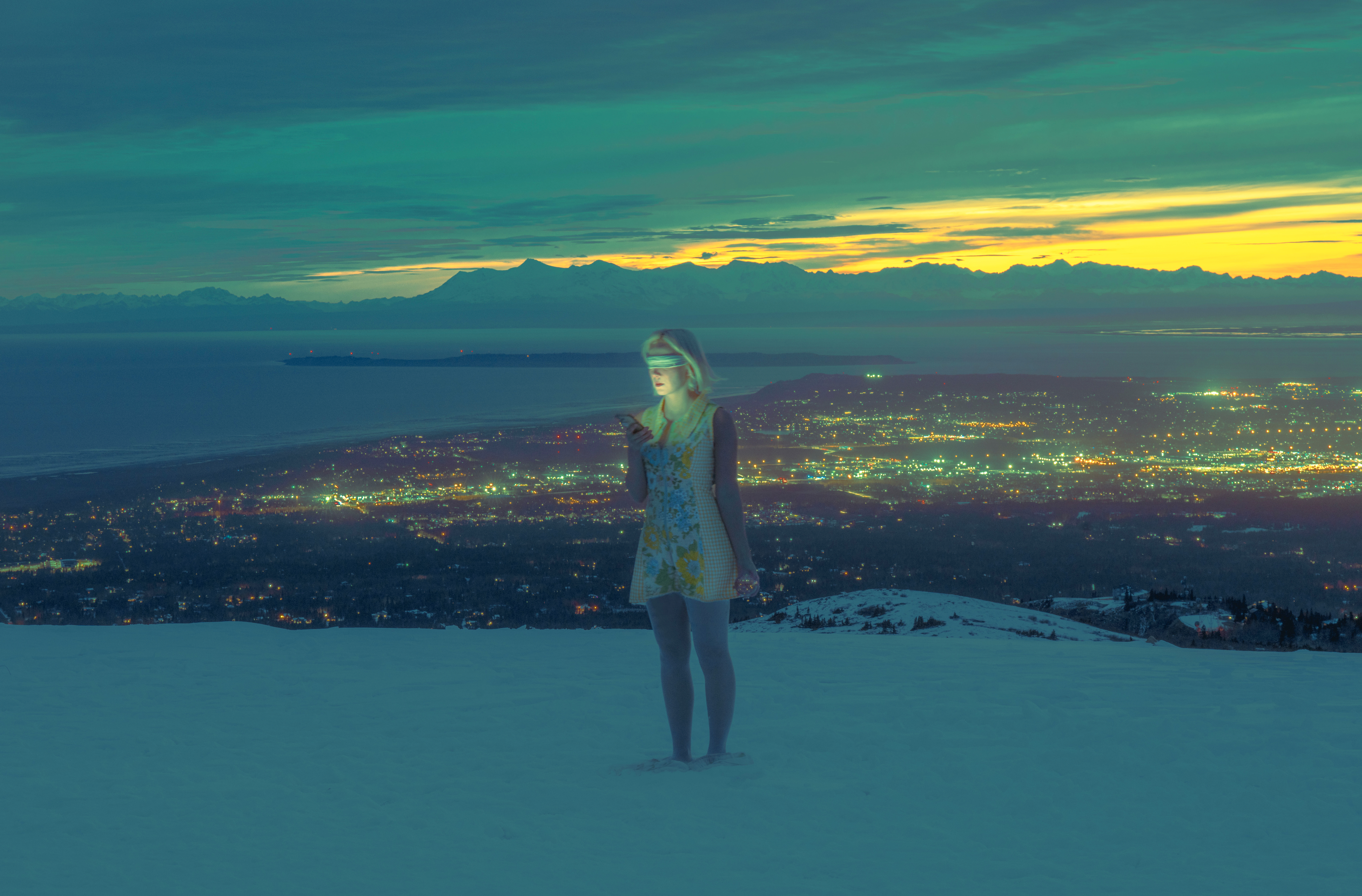 A woman stands in snow above a valley filled with city lights. The sky, rich in the colors of dusk, mirrors the pattern and hue of the lights below. The woman is blindfolded, yet is still looking down at her phone, which illuminates her face softly. She holds an orb in her left hand.