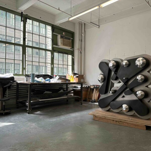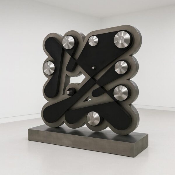 At the heart of the installation stands Floor Ringer (2024), a monumental sculptural expression from Cherniak’s iconic Ringers. Originally launched in early 2021, the series of 1000 quickly became one of the most well-known generative art projects, defined by the refined aesthetic of its limited palette and the elegant geometry of its signature string-wrapped “pegs”. Floor Ringer brings the code into three dimensions for the first time, here in stainless steel, patina, and aluminum. As a complement, Ringers (Algorithmic Interpolation) visualizes the compositional development of the algorithm, providing dynamic educational context in motion. This work is a preview of a project developed for the Tel Aviv Museum of Art, curated by Tal Lanir, and will be presented in full in April 2026.