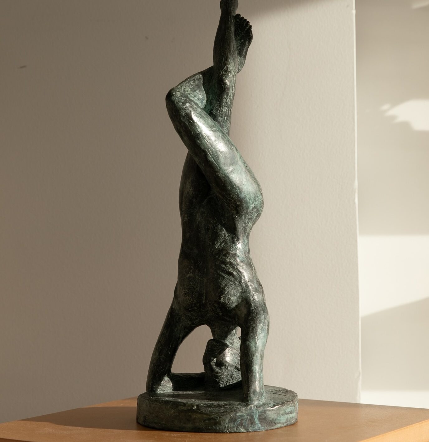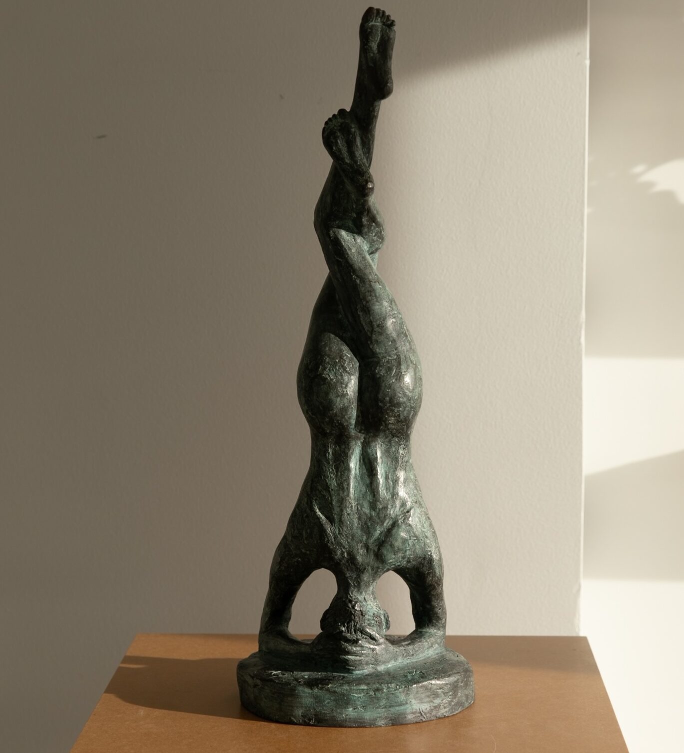 The iconic inverted pose—legs interwoven, hips elevated, weight balanced on the forearms—becomes a vortex of tension and harmony. In the photograph, the pose reads as breath and light. In bronze, it becomes structure, architecture, monument.